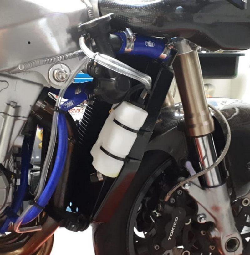 This coolant reservoir gives you more room around the engine for a better cleaning and wrenching